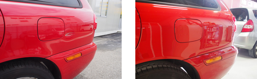 ヘコミを直した後の塗装作業ではヘコミ部分だけではなく周辺も同じように塗装することで色ムラが出ないようにしています。傷の部分だけを塗装する業者もたまにいますが、塗膜の剥がれや色ムラの原因になるためニコニコ板金では周辺部分もしっかりと塗装していきます。