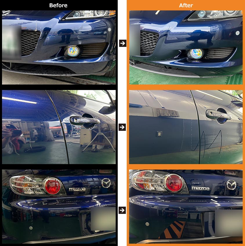 板金塗装ならニコニコ板金 > キズの具合 > マツダ RX-8のフロントバンパー・左クオーター・リアバンパー・右ドアの複数傷修理