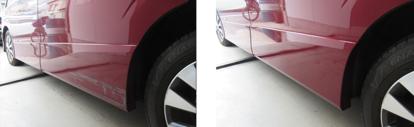 【修理内容】 左スライドドアマッドガード 交換 【担当スタッフのコメント】 日産セレナ、左側スライドドアの下部が広範囲に傷付いてしまっていました。ただし表面に傷が付いているだけで、車体フレームにゆがみなどは無い状態でした。 セレナやノアなどのように大型車の場合は死角が大きいだけではなく内輪差も大きいため、こうした箇所に擦り傷を作ってしまいがちです。 今回の修理では、傷が付いた部分... -