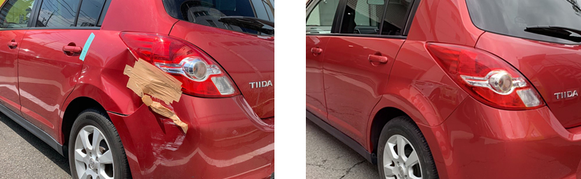【修理内容】 左リヤクウォーター新品交換 リヤバンパー修理塗装 左テールランプ中古交換 【担当スタッフのコメント】 日産ティーダの左後ろ側に傷やヘコミができた修理事例です。 写真の通り、リアクウォーターが大きく変形しているほか、リアバンパーの傷やテールランプの破損が見受けられました。 テールランプについては中古品が見つかったため中古部品交換となり、リアクウォーターは新品で... -