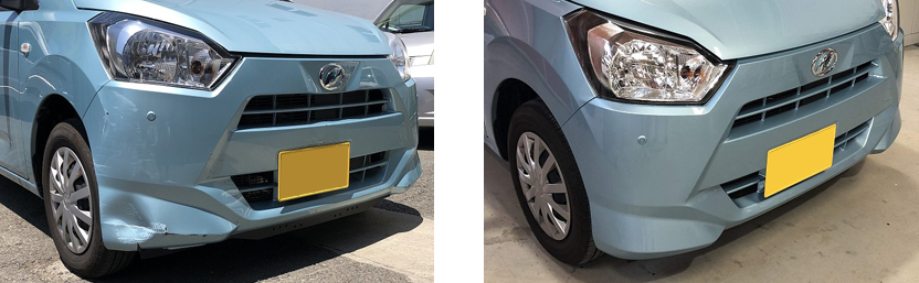 【修理内容】 フロントバンパー 新品交換 【担当スタッフのコメント】 ダイハツ ミライースのフロントバンパー左右にできたヘコミ傷の修理事例です。 最近の自動車は事故が起きた際の衝撃を和らげるために、昔の車よりもバンパーが柔らかい素材でできています。 特に軽自動車は燃費を良くするために全体が軽い素材で作られていることもあり、 バンパーによる衝撃吸収は他の車と比べても気を遣われている部... -