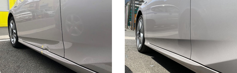 【修理内容】 左側フロントドア・サイドシル 板金塗装 【担当スタッフのコメント】 プリウスの左側フロントドアとサイドシルの間にできたヘコミ傷の修理事例です。 ドアとサイドシル(ドアの下の部分)どちらも傷がついており、作業工程としては2パーツを修理することになります。 少しの傷のようにも見えますが、塗装が剥げている状態は車にとって良い状態とは言えず、なるべく早く修理をすることをオス... -