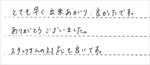 S様からお褒めの言葉をいただき、スタッフ一同大変うれしいです。