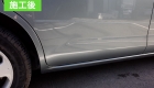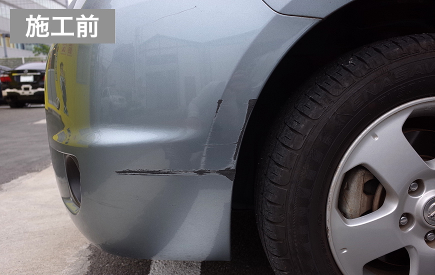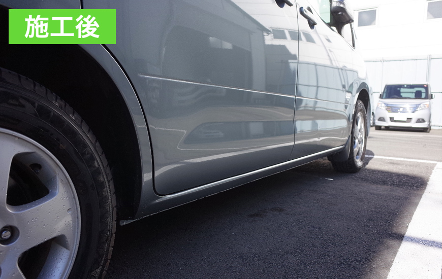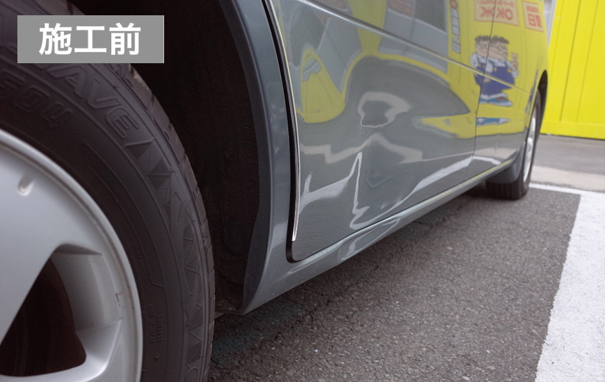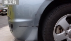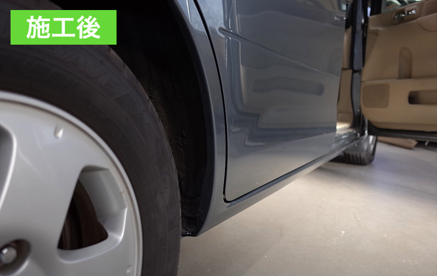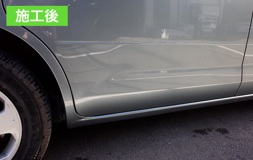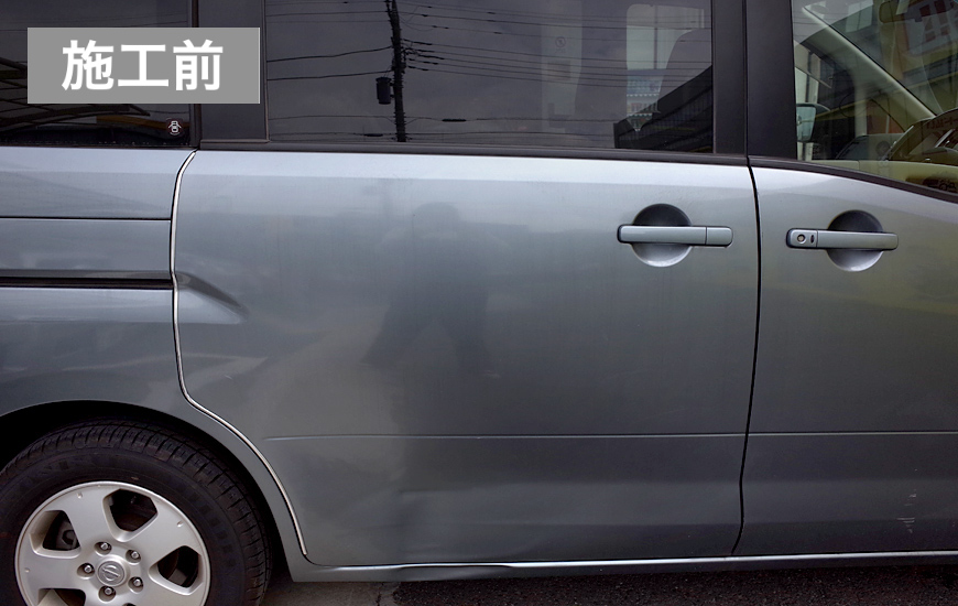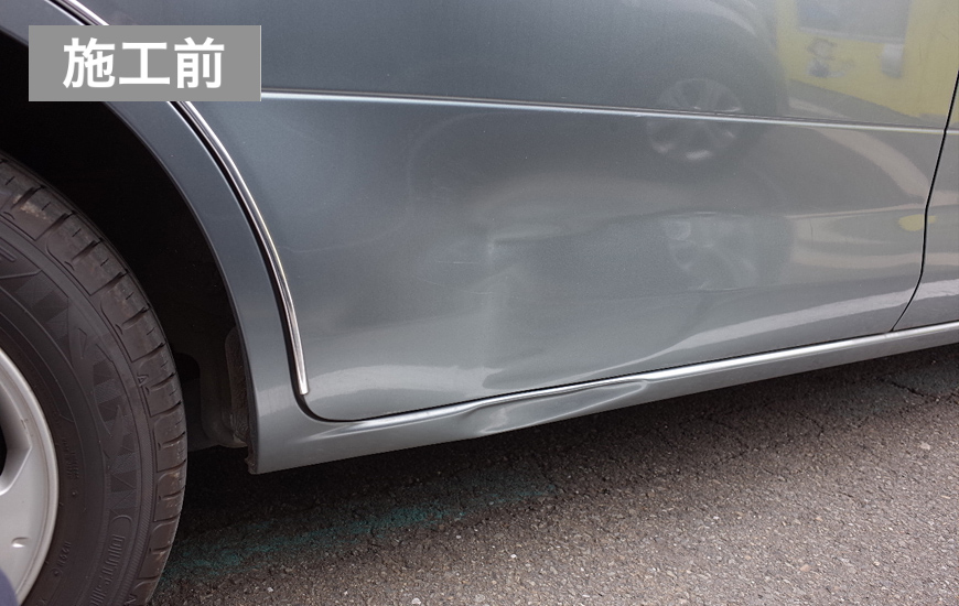 右後部ドアが30~50センチ四方にヘコミができてしまいました。それとは別にフロントバンパーの左角も20センチほどの長さの擦り傷があり、今回の修理で同時にどちらも修理をお任せいただきました。