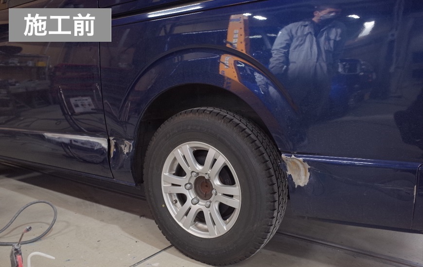 ニコニコ板金の近隣にある企業様から社有車のハイエースの修理を承りました。近くに会社があるということもあり、直接お店までご来店いただきました。